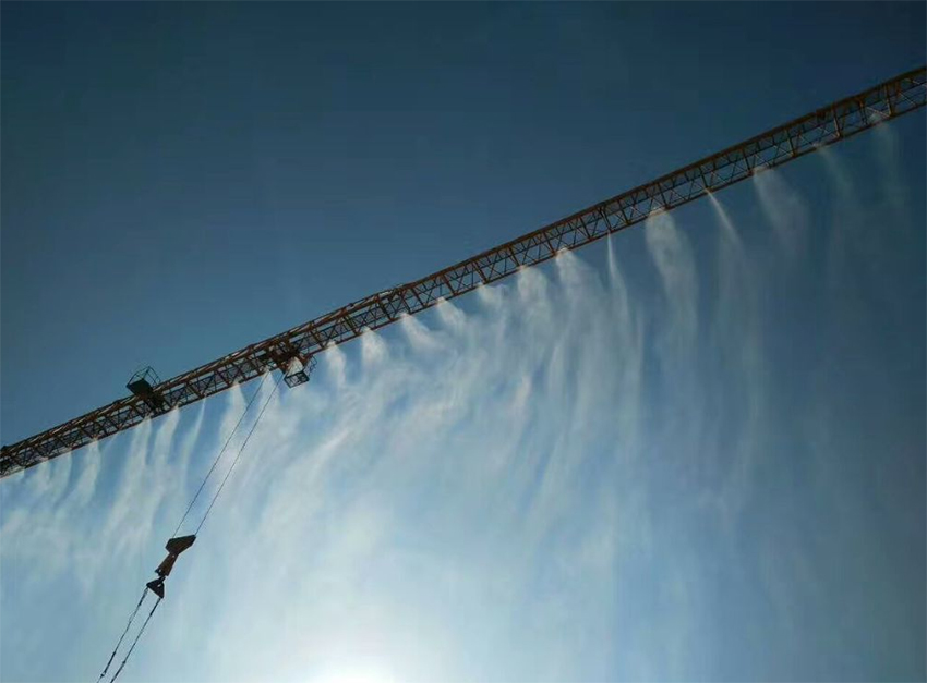 塔吊橫臂始終在工地的至高點,噴水系統(tǒng)在塔吊的旋轉范圍內進行全方位、零死角霧狀噴水,水通過噴嘴射出飄飛的水霧,可有效吸附空中的灰塵顆粒和雜質,可以控制工地揚塵不往外擴散,起到降塵的作用,同時在高空噴淋一段時間后,地面將形成一片濕潤狀態(tài),能有效的壓制住灰塵重新?lián)P起。