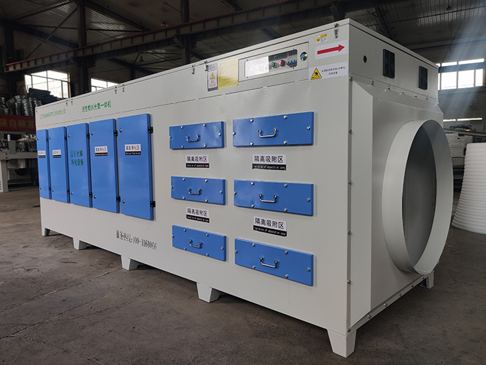 當(dāng)惡臭氣體利用排風(fēng)設(shè)備輸入到本凈化設(shè)備后,凈化設(shè)備運(yùn)用高能C波光束及臭氧對(duì)惡臭氣體進(jìn)行協(xié)同分解氧化反應(yīng),使惡臭氣體物質(zhì)其降解轉(zhuǎn)化成低分子化合物、水和二氧化碳,再通過(guò)排風(fēng)管道排出室外。